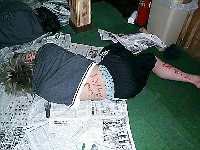 9月25日 「太り気味の私はアブト○ニックを買う金がないの日」 昨日は私の先輩に当たる、Y姉さんの24回目の誕生日でした。 「四捨五入すればまだ二十歳だよ!」 と豪語する彼女の姿・・・あぁ美しい(笑) プレゼントは皆でマルボロ1カートンを送りました。おめでとうございますヽ(゚∀゚)ノ バースデー飲み会はS君宅にて行われました。 しかし私は夜勤のバイト後学校に行き、さらにバンドの練習に行くと言う ハードスケジュールだったため、すぐに就寝(; ̄Д ̄) ショボイ・・・ 私の周りの人間の前で寝ることは、実は危険な行為だったりします。 酔って寝てしまったものは言わば「敗北者」。 敗北者は起きている「勝利者」からペナルティを与えられることが多々あるんですよ。 こんな風にね(((( ;゜Д゜)))ガクガクブルブル これは合宿の時の画像です。 酔って潰れたリベロ。体から顔中に素敵な落書きアートが施されていました(鬱 と言う訳で、飲み会中は安心して寝ていられないんですよ。 そして、今日AM5:00に起きました。早速鏡を見て自分の姿を確認します。 ほっ(´o`)どうやら落書きは免れたみたいです。 それにしてもジーンズが冷たいなぁ・・・・・ってああ!!(;° ロ°) S君宅の猫、北斗君に小便をかけられていました。 帰宅後、朝も早い時間からジーンズを洗う私。せつねぇ・・・・ どうも、小便臭いリベロです。 ジーンズが乾かないよ〜〜あ〜〜あ〜〜〜〜〜(´△`) 食欲の秋ですね。この記事を読んで思いました。 いや、直径3メートルはさすがにでかすぎだと思いますが(^^;) これからドンドン寒くなりますし、脂肪を蓄えて厳しい冬に備えなければなりません(ぉ でも太りたくない!って方は私のダイエット法を参照していただくとして。 これから太る予定の方、 季節外れのスイカ食べ放題ツアーなんていかがですか?(マテ 捨てるなんてとんでもない。自分のエネルギーにしてしまいましょう( ̄ー ̄) もう太ってる方はアブト○ニックを使って頑張ってみましょう。 こんな目にあっても保障はしませんけどね(笑)