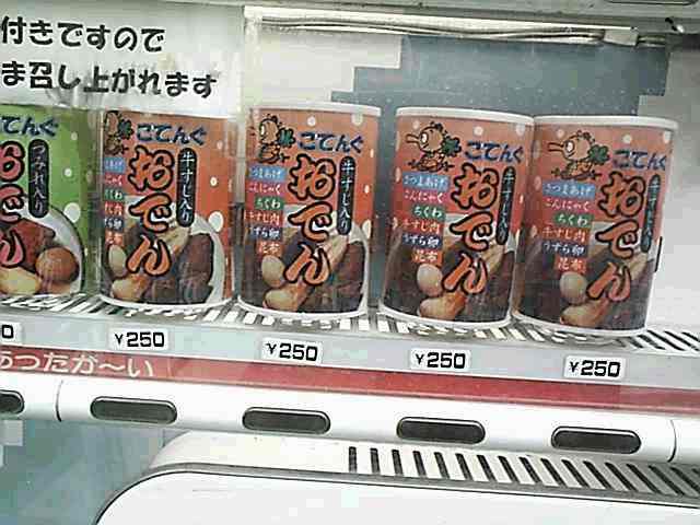 9月10日 「おでんも全自動で販売されていた事に気付いた日」 今日は所用で、車で都内まで行ってきましたε=ε=(┌ ・)┘ 助手席には、以前バイト先の先輩だった馬さんが座ります。 それにしても都内の道は私にとって脅威ですよ(ぉ 普段、埼玉奥地の平坦な道を走っているものですから、交通量のギャップがすごい(^^;) 周りの車は車線変更しまくるわ、遠慮なしに割り込むわ・・・ バイクや原チャリは、その流れる車の網目をスイスイ縫って行くわ・・・ 神経がすり切れそうだったYO!(~ヘ~;) 結局途中で馬さんに運転を代わってもらいました(敗北) そして、私たち二人が所用を済ませた後・・・・・・・・・・・ 馬:「じゃぁ行きますか!?」 リベロ:「そうですね!!」 リベロ&馬、秋葉原 降臨!(笑) どうも、リベロです(=°-°)ノ 馬さんのドライビングテクニックと都内の交通情報把握能力は、 尋常じゃないものがあります(汗) 今日はどうもお世話になりました(シ_ _)シ ハハァーー さて、何時ものように秋葉原探索です。AM10:00過ぎに到着したのですが、 この時間はまだ秋葉原は眠っているんですねぇ。 それでもしっかりOPENしているメッセサンオー(笑) 相変わらずオタクの強い味方です(´Д`) そこで時間を潰した後、ヤマギワ電機のCD〜DVD〜ゲームコーナーを練り歩いていると・・・・・・・ おぉぉぉぉぉ!これはぁ!?(;° ロ°) LEAF PIANO COLLECTION VOL.1じゃないですか! どれどれ楽曲を見てみると・・・・・・・・・・・ブハッ(;゜∀゜)=3 この前合宿で萌えに萌えまくった「To Heart」の曲やら、その楽曲のクオリティーに何事かと思ったら 「実は折戸伸治が参加していたよ」的な「雫」の曲が入っているじゃないですか! ・・・・・・・・・・・・あ、「痕」の曲も入ってる(。_。;) 店員:「ありがとうございました〜〜」 買っちゃった(笑) ふう、金が無いって時に限ってこんなCDを見つけてしまうから困りものだ、 馬さんから金を借りてまで買ってしまいましたよ(; ̄Д ̄) さて、そろそろ帰りますか〜〜〜〜〜〜〜っと、おぉぉぉぉぉ!これはぁ!?(;° ロ°) [The Cyber Slayer]鬼哭街のサントラじゃないですか! どれどれ楽曲を見てみると・・・・・・・・・・・くっはぁ(≧▼≦;) 私の大好きな曲[Supersonic Showdown]のリミックスや、[涙尽鈴音響]の インストバージョンまで新たに収録されているじゃないですか! ・・・・・・・・・・・・あ、良心価格で2000円だ(。_。;) 店員:「ありがとうございました〜〜」 ああああああまた買っちゃったぁ!( ̄□ ̄;) また馬さんからさらにお金借りてしまった(汗) あぁ、私ったら罪深い男(死ね 罪悪感に苦しんでいると、Sofmapのゲーム館に行っていた馬さんが、 しっかり[結い橋]と[DISCIPLINE]と[斑鳩]と[真・三國無双2 猛将伝]を買って帰ってきました(笑) 同類項だなこりゃ(^^;) ダメな買い物を済ませて、「さて帰ろう」となった時、 私はちょっと信じられないような光景を目にして立ち止まりました。 えっ!?(;° ロ°)こ・・・・・・・この自動販売機・・・・・・・おでん売ってるYO!(゜ロ゜) 馬さんに聞いて見たら、「秋葉原フリークは皆知っているよ」と言われました。 いやいや、おかしいでしょ?これぇ(; ̄Д ̄) 具が缶口からちゃんと出て来るのかが心配です(笑) そして、帰りも馬さんに車を運転してもらって、馬さん宅へ。 そこからは自分で帰宅しました( ̄-  ̄ ) なかなか内容の濃い一日でしたよ(ぉ