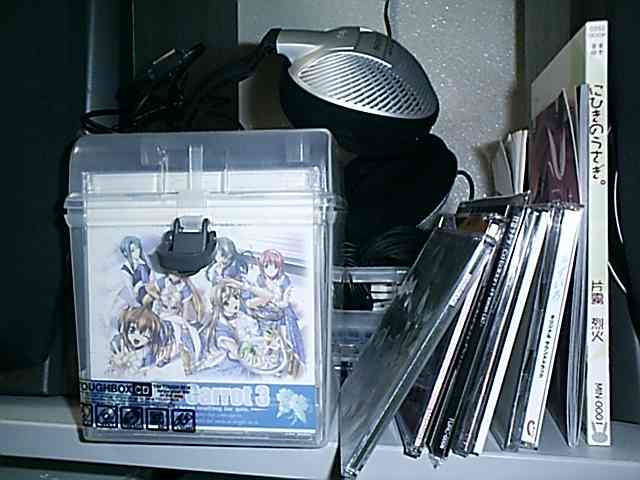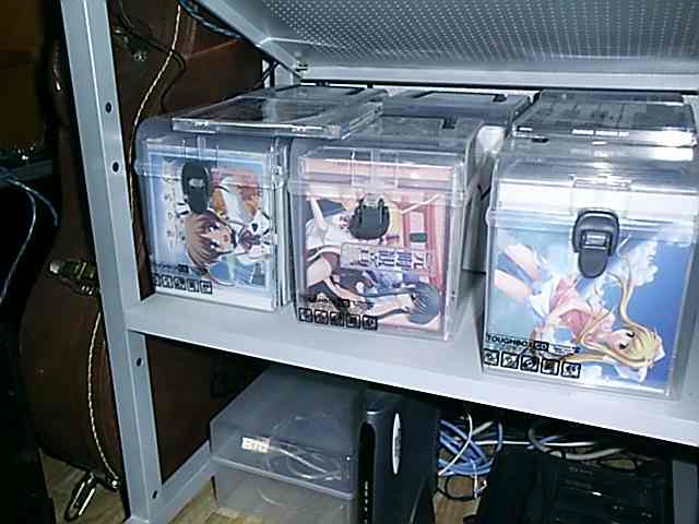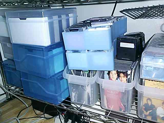 10月5日 「機材を愛する日」 私だって6畳1間の狭い部屋のために考察しまくっとるわい(挨拶) まぁ音楽をプレイする人も聴く人も、この問題に直面する時は多々あると思いますが。 私のCD所持枚数は、今ざっと部屋を見た感じ300枚ぐらいでした。 これでもヘビーCDバイヤーの方と比較すれば、かわいいもんなのでしょう、 3分の1が萌え同人音楽CDである事実を除いてね。 まだだ。まだ、終わらんよ!(何がだ 収納方法としては、100円ショップのプラスチック製収納BOXを活用しています。 でもこれが結構な具合でかさばるんですよ(^^;) 馬さんみたいに変態的な巨大CDラックを購入する金も場所もないし。うぐぅVHS、MD、8cmCD等はこんな感じですね。もうパンパンですよ(。_。;) 下のほうに隠してあるえちぃビデオを取る時なんて、面倒くさくてたまらん(オイ