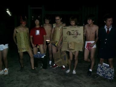 10月30日 「仮装パレード準備の日」 携帯がいよいよ止められました(挨拶) そんなお金を払う余裕は少しも無いのさ、ヤングメン。 まぁ、身内で私の家の電話番号を知っている方は大丈夫でしょうが、 携帯番号しか知らない方はまず私を捕まえることは出来ないでしょうね。 身銭を切って携帯を復活させるよりは、 今夜の夕食に無事にありつけられた方が、私は幸せなんですよ。ふぅ。 3分間で出来る温もり〜熱いカップラーメン握り締め〜♪ あ、なんか惨めになってきた。いいさいいさ(ノ_<。)うっうっうっ どうも、リベロです(´△`) 私の大学の文化祭開始が、もう目の前まで迫ってきてます。 それで私が所属する軽音楽部では、文化祭宣伝用に毎年仮装パレードが企画されます。 と言っても仮装して街中を歩いたりする訳ではないんですけどね。 言わば自己満足企画なんですが(ぉ 何の仮装をするかは2回生が企画し、仮装をするのは1回生です。 それで、軽音楽部の仮装では絶対守らなければならないルールがあります。 一つ、材料はダンボールを使うこと。 一つ、男子はブリーフを着用すること。 これだけ(笑) 毎回テーマは違うんですが、やってることは下ネタだけなんですよね。 私が仮装をした時は「金八先生」がテーマでした。 それで私は女子高生の役をやったんですが、 ブリーフを着用した女子高生なんて何処にいるんでしょう。 そして今日はその仮装に使う衣装を作成すると言うんで、私は様子を見に行きました。 2回生の指示を受け、1回生が衣装作りをしています。 その横で私は北千住や問屋さんと格闘ゲームに興じていました(オイ 嫌な先輩だな、俺って(^^;) そして衣装が完成。早速お披露目です。普通に全裸の人がいるのは何故でしょうか。 しっかし…卑猥な画像ですねぇ(;´д` ) モザイクをかけている時に惨めな気持ちになってしまいましたよ。 でもこの寒空の下ブリーフ1枚で歩く姿は、なんだかすがすがしい気もしたりして。 是非とも全員このまま警察に連行されちゃってください(オイ お披露目の後は飲み会でした。 私と北千住は、一騎打ちで格闘ゲーム飲みです。 負けたら一気飲みと言う、シンプルでありハードな内容。 格闘ゲームの勝敗なんてすぐに決まりますからね…… リベロ「やっべ、負けたぁ。じゃあいただきます」 北千住「俺はこのゲーム強いっすよ〜」 リベロ「やっべ、また負けたぁ。いただきます」 北千住「今のはいい勝負でしたね〜」 リベロ「お前強いなぁ、くそぉ〜いただきます」 北千住「いやいやリベロさんも強いっすよ」 リベロ「いただきます」 リベロ「いただきます」 リベロ「いただきます」 リベロ「い…」 そして起きたら朝でした 私の横には酒でびしょ濡れになっていたゲームソフトと、酒で潰れた者達。 私が気を失っている間に、一体何があったのでしょう。 北千住にリベンジを誓いながら、2日酔いの私は帰宅したのでした。