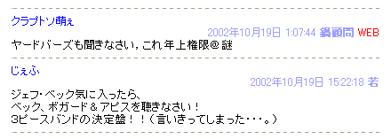 10月24日 「僕達は追い〜かけて〜♪の日」 昨日はAM4:00頃まで、ネット徘徊。 萌えな壁紙とかをいろいろダウンロードしてたりしてました。 いや、キーボードとかシンセのカタログとかも見てました…よ?うんうん。 で、次の日の授業はAM11:00。目覚ましを10時にセットして布団にもぐりこみました。 そして… 「プルルルルルルルル」 「プルルルルルルルル」 うぅ〜誰だよ〜、まだ7時半じゃん(´〜`) 寝ぼけながら家の電話を取る私。 「あ”ぃ、もしもし〜」 「あ、どうも〜奥様はいらっしゃいますか?」 奥様?はて、コノヒトハナニヲイッテイルノデショウ 私が埼玉の奥地に住んでいるので、「奥玉」とでも言いたいんでしょうか? 「奥玉は私ですが」 「えええぇ?いや……奥様は、いらっしゃいます?」 「ですから私が奥玉…」 「あ、失礼しました〜」 ガチャン ツーツーツー…… ふん、私の心地良い睡眠を邪魔しおってからに。 こうして2度寝に没頭する私でした。 どうも、リベロです(*・_・*) 先日、Jeff Beckの「Blow By Blow」を借りたら以外に良かったってな話をしたんですが、 その後掲示板にて、ってなことを言われたので、今日「YARDBIRDS」や、「Beck,Bogert & Appice」 を借りに近所のTUT○YAに行ってみたんですよ。 でもいくら探しても見当たらないので、店員さんに聞いてみたら、 「当店では扱っていない」とのこと。う”〜残念。 洋楽をたくさん置いてあるレンタルCD屋さん、誰か知りませんかねぇ( ̄-  ̄ ) しょうがないので、以前から借りたいと思っていた、ユニコーンのベストを探します。 あ、貸し出し中…くそ〜 しかたないので、以前から借りたいと思っていた、ローリングストーンズのベストを探します。 あ、貸し出し中…マジで〜 めげずに、以前から借りたいと思っていた、天空の城ラピュタのサントラを探します。 貸し出し中かよぉぉぉぉ!(T△T) なんだよ、この店は、2度と来るか! ラピュタまで借りられなかったのは正直ショックでしたよ。にゃう〜ん 当初の予定では、久石 譲先生の旋律にウットリしながら小説を読むはずだったんですが、 残念ですねぇ。 仕方ないので、今日は萌えゲームサントラを聞きながらまったりすることにします(ぉ 本日のナンバーは、Key Sounds Labelより「AIR Original SoundTrack」から、"鳥の詩" 消〜える ひこ〜うき〜ぐも〜〜♪