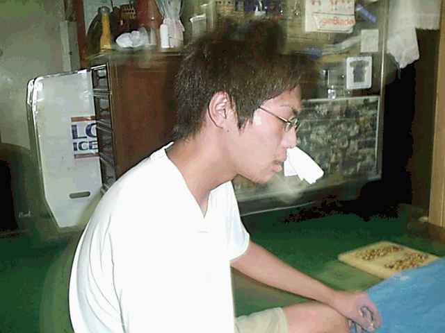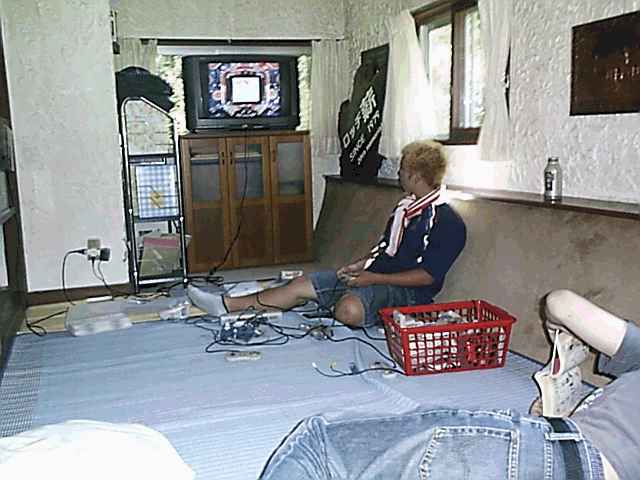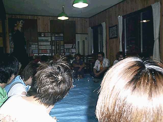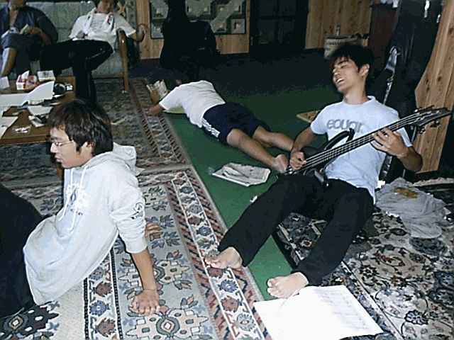 もはや、無法地帯(笑) バンドの練習時間には予めタイムテーブルが決められています。 まぁこうして、自分が所属するバンドの練習時間になるまで、 好き勝手にやるわけなんですよ(^^;) 私は今回、3つのバンドに所属しています。 まずRe−NacLにボーカルとして参加。 そして忌野清志郎さんのコピーバンドにて、ボーカルギターとして参加。 ラストにエアロスミスのコピーバンドで、ギターを担当いたしました( ̄ー ̄) 各バンド、練習時間は1時間半から2時間程度です。 つまり私は1日の間の5時間近くはスタジオに入っていると言う訳ですね。 あぁその時間をエ○ゲに(以下略) 昼食後も同じ感じで1日は過ぎていきます。 そして、夕食後。また飲み会が始まってしまいました(--;) 軽音楽部の合宿で行われる飲み会は、いつ誰が酒で潰れてもいいように、 ビニールシートの上で輪になって座りながらやります。